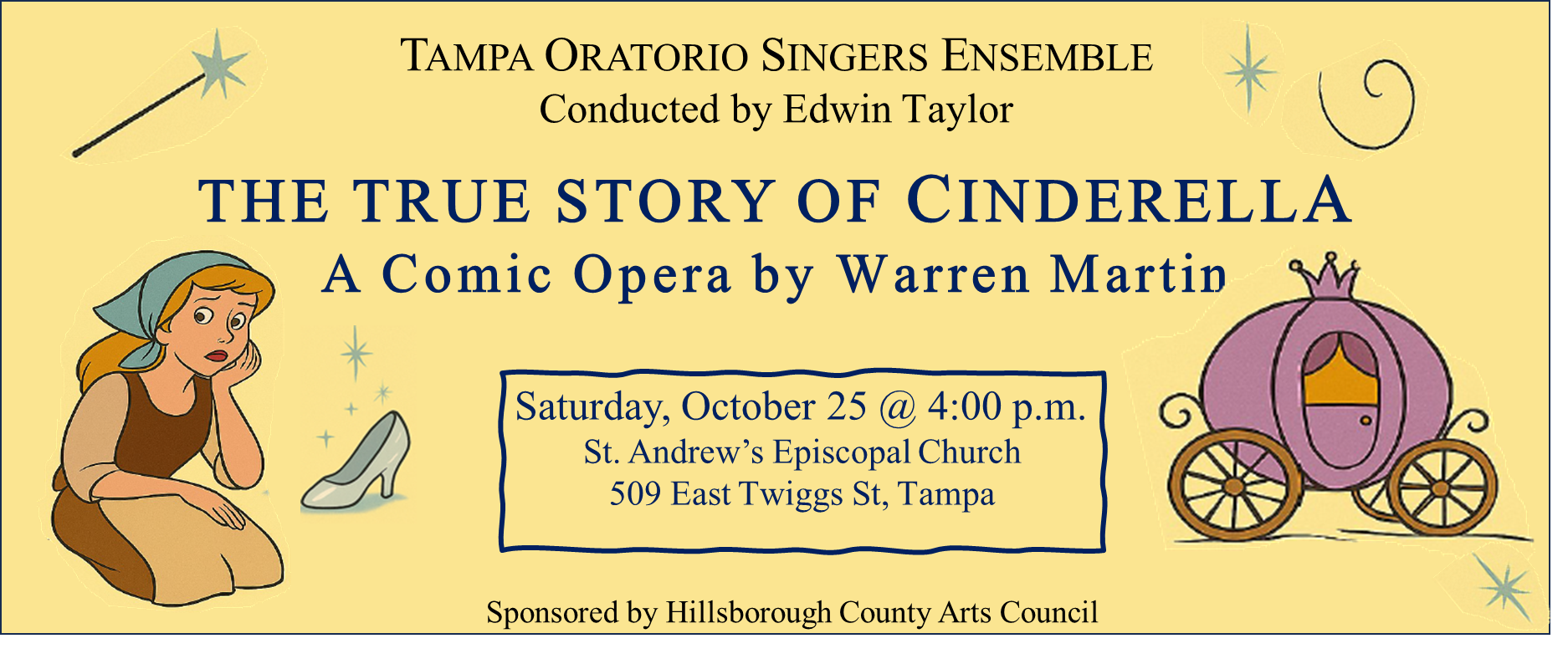 Description: | ![]() The True Story of Cinderella, by Warren Martin (1916-1982), is a light-hearted and hilarious ‘take’ on the classic Cinderella story, with several unexpected twists in the plot and with the promise of"happily ever after". Enjoy a magical evening with an ensemble of twelve TOS singers as we present the first-ever oratorio-style performance of this unique and clever tale in the Tampa Bay area. Our own TOS Tenor Section Leader Edwin Taylor will direct and accompany this performance. Saturday, October 25 @ 4:00 p.m. St. Andrew's Episcopal Church 509 East Twiggs St, Tampa Tickets: $25 Proceeds will go toward the Tampa Oratorio Singers’ mission to bring high quality classical music to our region. |